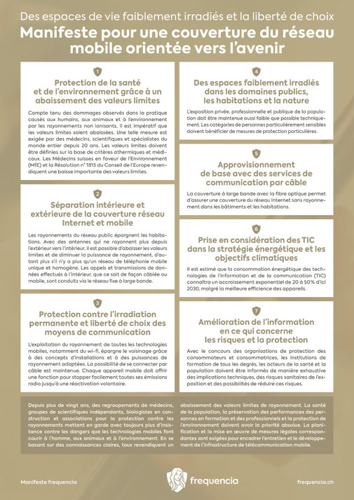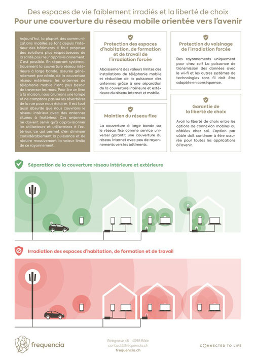 (1) Cette initiative est lancée au printemps 2020, pour diminuer l’irradiation de la population. (2) En renonçant au principe absurde actuel selon lequel la couverture réseau intérieure est assurée par des antennes extérieures, il est possible de bénéficier d’espaces de vie faiblement irradiés et d’un abaissement considérable des valeurs limites. (3) Personne ne doit être irradié de force à son domicile par les diverses sources de rayonnement des technologies mobiles. (4) Il est prioritaire de stopper l’installation du réseau de téléphonie mobile 5G.